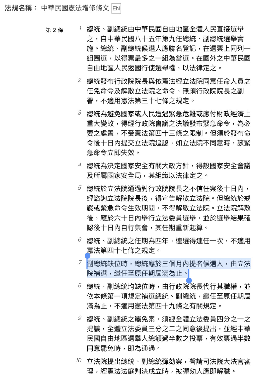 副總統缺位時,總統應於三個月內提名候選人,由立法院補選,繼任至原任期屆滿為止。