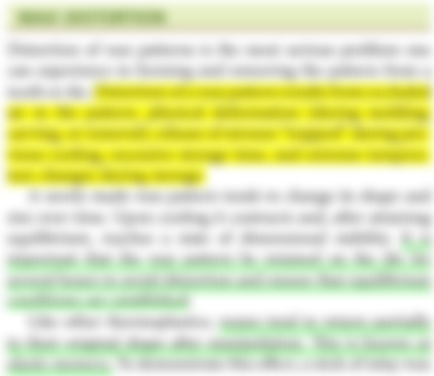 30.下列何種因素可能導致蠟型(wax pattern)發生變形?①外力 ②殘存應力釋放 ③蠟材料自身 的流動性(flow)與所處的環境溫度 ④蠟材料所處的環境濕度 (A)①②③ (B)①②④ (C)①③④ (D)②③④