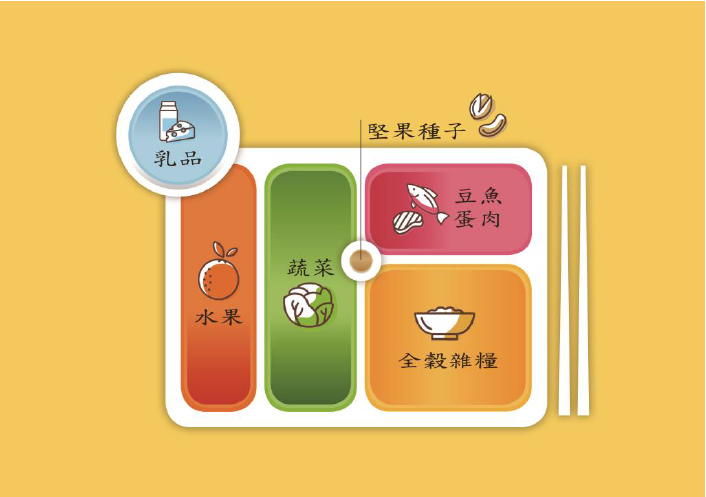 國民健康署於107年公布「我的餐盤」圖像,將每日應攝取的六大類食物:全穀雜糧、豆魚蛋肉、蔬菜、水果、乳品與堅果種子以圖像呈現,並設計6句簡易口訣「每天早晚一杯奶、每餐水果拳頭大、菜比水果多一點、飯跟蔬菜一樣多、豆魚蛋肉一掌心、堅果種子一茶匙」