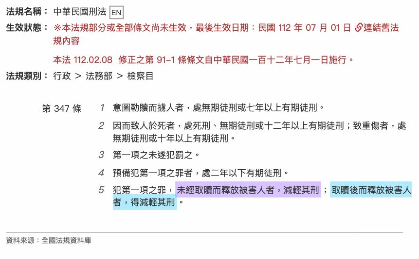 修法後,立法者為顧及被害人人身安全,免生撕票悲劇,該條前段規定未經取贖而釋放被害人者,(必)減輕其刑,後段規定取贖後而釋放被害人者,得減輕其刑。足見修法後,只要釋放被害人,即有機會獲得減刑寬典。