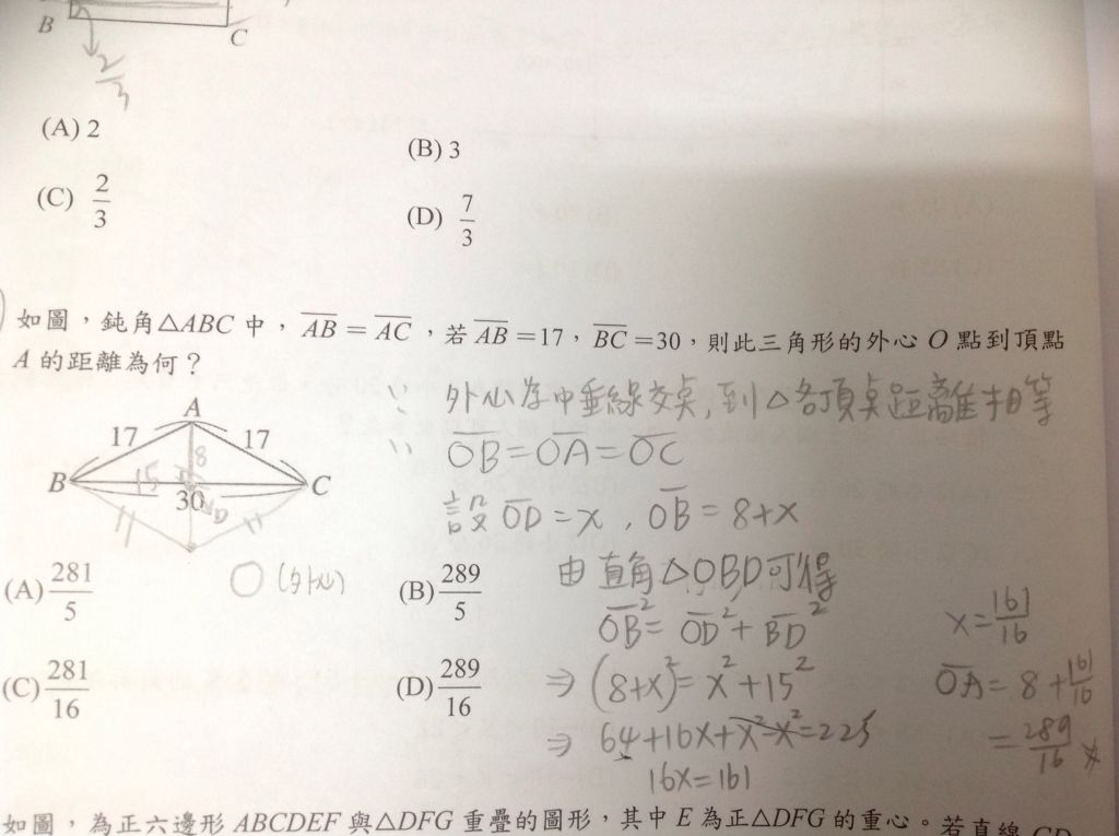 鈍角△ABC 中, AB = AC ,若 AB =17, BC =30,則此三角形的外心 O 點到頂點 A 的距離為何?