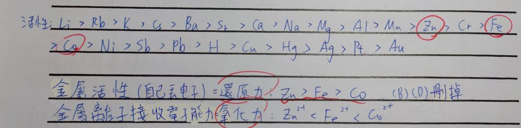 33. 已知 Mn + Zn2+ → Zn + Mn2+,Fe + Co2+ → Fe2+ + Co,又 Fe 和 Zn2+不發生反應,則下列何者正確?