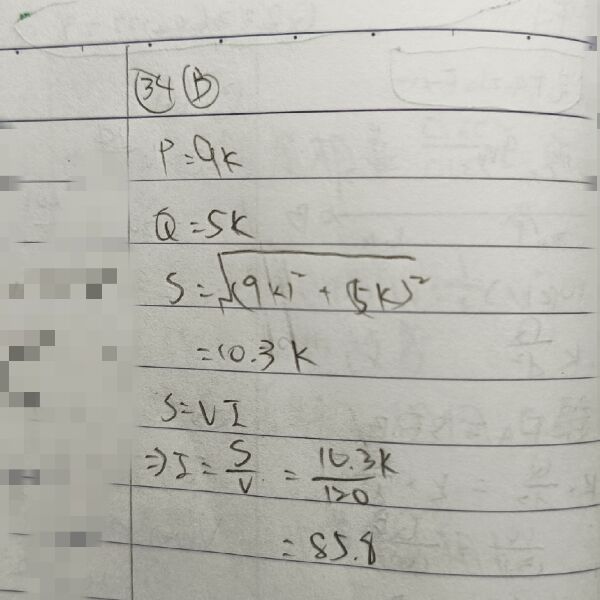 34 有一個 9 kW 的電感性負載在 120 V/60 Hz 下有 5 kvar 的虛功率,求流入負載的電流?