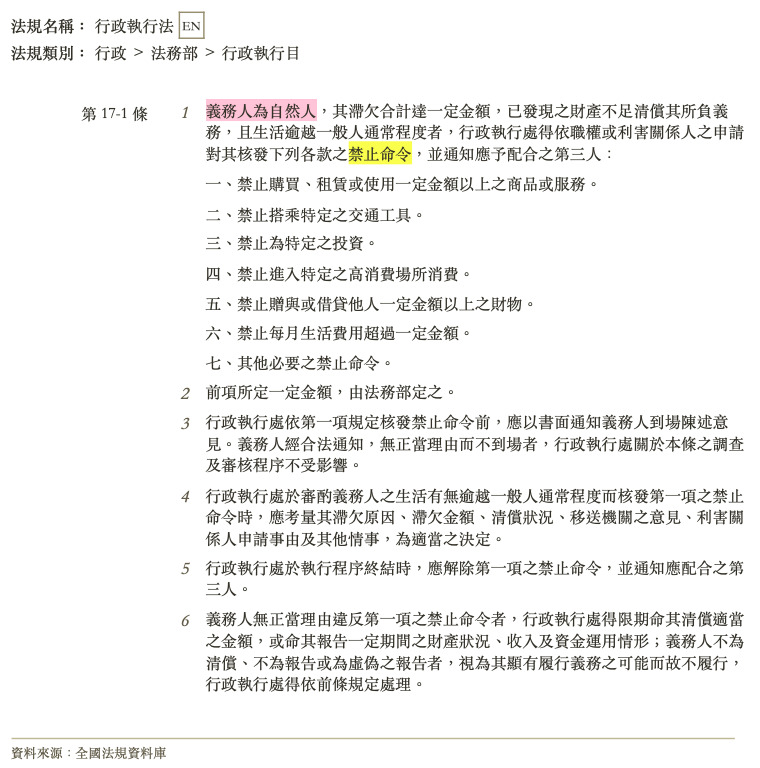 義務人為自然人,其滯欠合計達一定金額,已發現之財產不足清償其所負義務,且生活逾越一般人通常程度者,行政執行處得依職權或利害關係人之申請對其核發下列各款之禁止命令,並通知應予配合之第三人:
