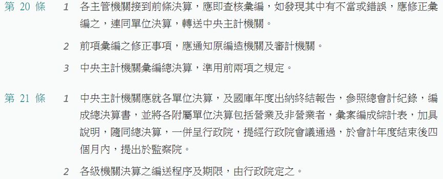 34 有關行政院主計總處查核彙編中央政府總決算暨附屬單位決算及綜計表,依決算法第 20 條及第 21 條規