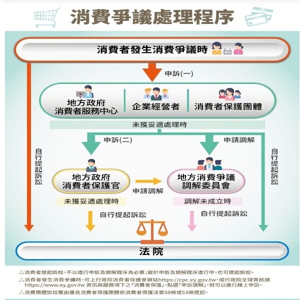 依消費者保護法(以下簡稱消保法)第43條第1項規定,消費者與企業經營者因商品或服務發生消費爭議時,消費者得向企業經營者、消費者保護團體或消費者服務中心或其分中心申訴。