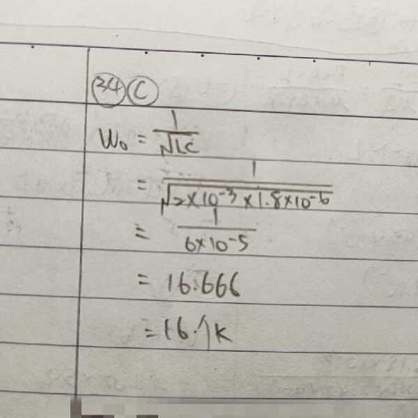 34 RLC 並聯諧振電路中,R = 104 ohm、L = 2×10-3 H、C = 1.8×10-6 F,該電路之諧振頻率 ω0為多少(rad/s)?