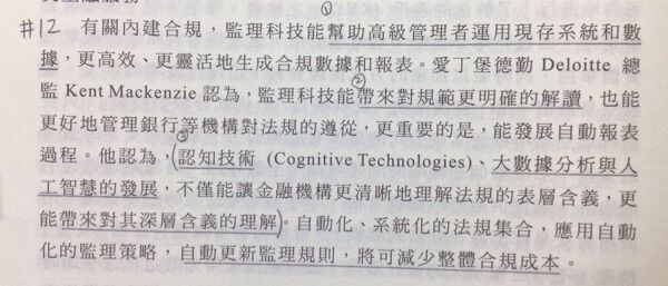 ~最後~在第5行提到...認知技術、大數據分析與人工智慧的發展,不僅能讓金融機構更清晰地理解法規的表層含義,更能帶來對其深層含義的理解。自動化、系統化的法規集合,應用自動化的監理策略,自動更新監理規則,將可減少整體合規成本。