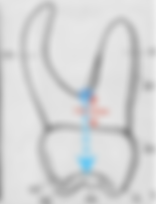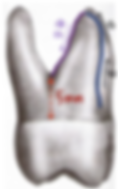(D)遠心面觀,可見兩個牙根,其分叉處(bifurcation)距齒頸線約2~3 mm