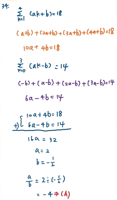 Step 3:兩式解連立,得a=2, b=-1/2,所以a/b=-4
