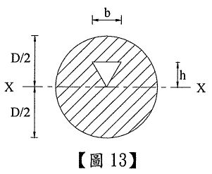 34. 如右下【圖13】所示,斜線斷面之慣性矩(Ixx)為:(三角形之形心軸慣性矩為 Ixc=bh³/36)(A) πD²/32-bh³/12(B) πD²/64-bh³/12(C) πD²/64-bh³/4(D) πD²/32-bh³/4
