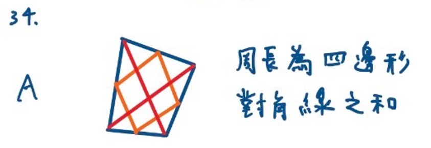 34. 將任意一個四邊形的四邊中點依順時鐘的順序連接後,可形成一個新的四邊形。有三個敘述如下: 甲、新的四邊形一定是平行四邊形 乙、新的四邊形面積為原來四邊形面積的一半 丙、新的四邊形周長為原來四邊形周長的一半 請問哪些敘述恆真?