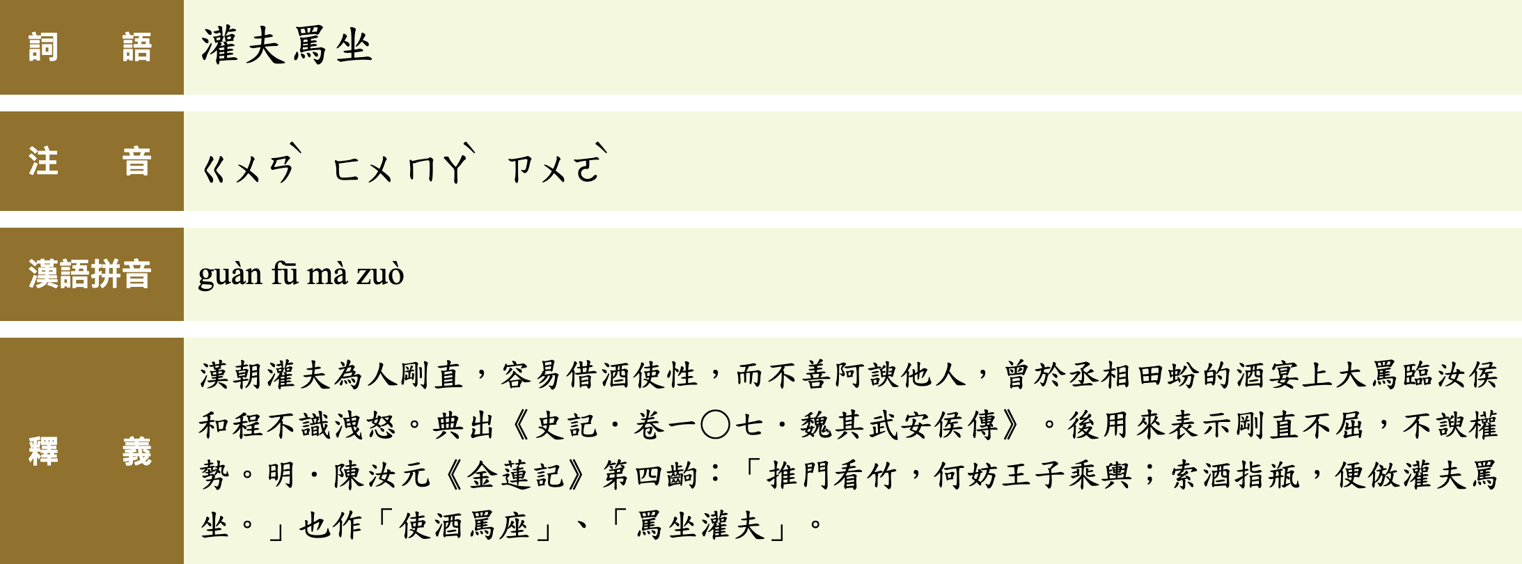 漢朝灌夫為人剛直,容易借酒使性,而不善阿諛他人,曾於丞相田蚡的酒宴上大罵臨汝侯和程不識洩怒。典出《史記.卷一○七.魏其武安侯傳》。後用來表示剛直不屈,不諛權勢。明.陳汝元《金蓮記》第四齣:「推門看竹,何妨王子乘輿;索酒指瓶,便倣灌夫罵坐。」也作「使酒罵座」、「罵坐灌夫」。