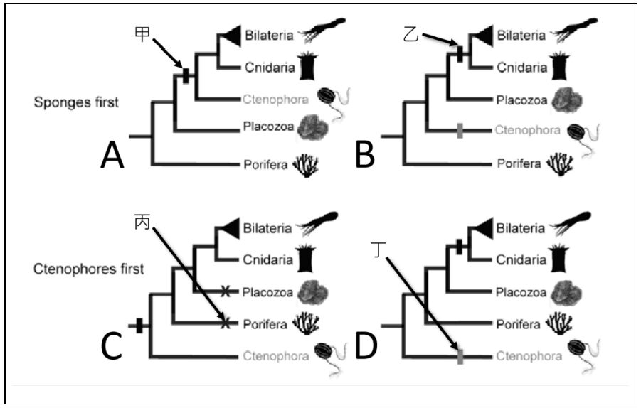 34. 根據下圖 ABCD 分別代表動物主要類群早期演化的不同假說。請問以下演化事件的標註何者正確? 註:Bilateria (兩側對稱動物);Cnidaria (刺絲胞動物門);Ctenophora (櫛版動物門)、 Placozoa (扁盤動物門);Prolifera (海綿動物門)