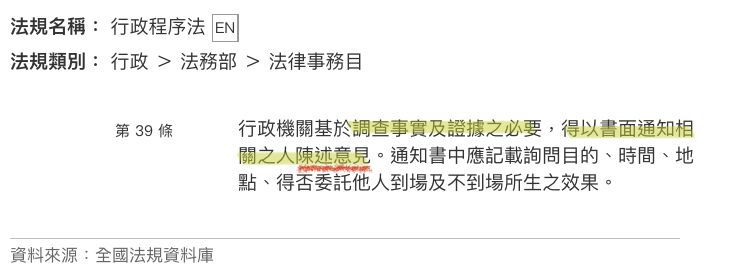 行政機關基於調查事實及證據之必要,得以書面通知相關之人陳述意見。通知書中應記載詢問目的、時間、地點、得否委託他人到場及不到場所生之效果。