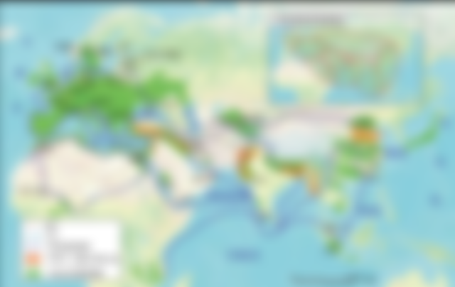 35. 中國一帶一路的區域經濟發展策略之一,係以過去漢代的陸上絲綢之路為主軸,強化與他國的貿易往來。中國透過此絲綢之路,最可能在圖8中何區設立農業研究中心,以期未來該區的農業生產可就近出口至國外?