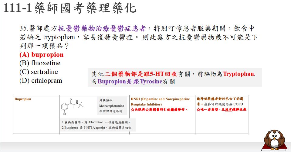 35. 醫師處方抗憂鬱藥物治療憂鬱症患者,特別叮嚀患者服藥期間,飲食中若缺乏 tryptophan,容易復發憂鬱症。 則此處方之抗憂鬱藥物最不可能是下列那一項藥品?