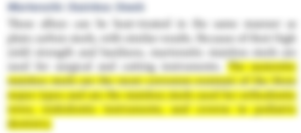 Ferritic stainless steel: 抗腐蝕性佳, 不能經熱處理硬化或是加工硬化, 少在牙科應用.