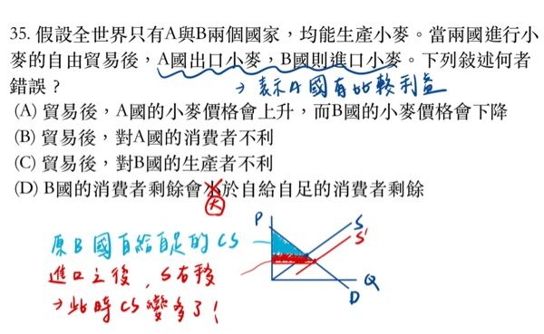 35. 假設全世界只有A與B兩個國家,均能生產小麥。當兩國進行小麥的自由貿易後,A國