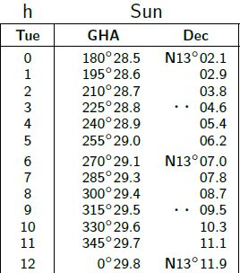 如航海曆所示,太陽每日正午12點GHA會接近360°,所以只要用GHA360°減去GHA235° 24'後,再除15°求出能夠從12點回推的時間08h18m24s,接著用正午12點減掉08h18m24s就能求出答案。
