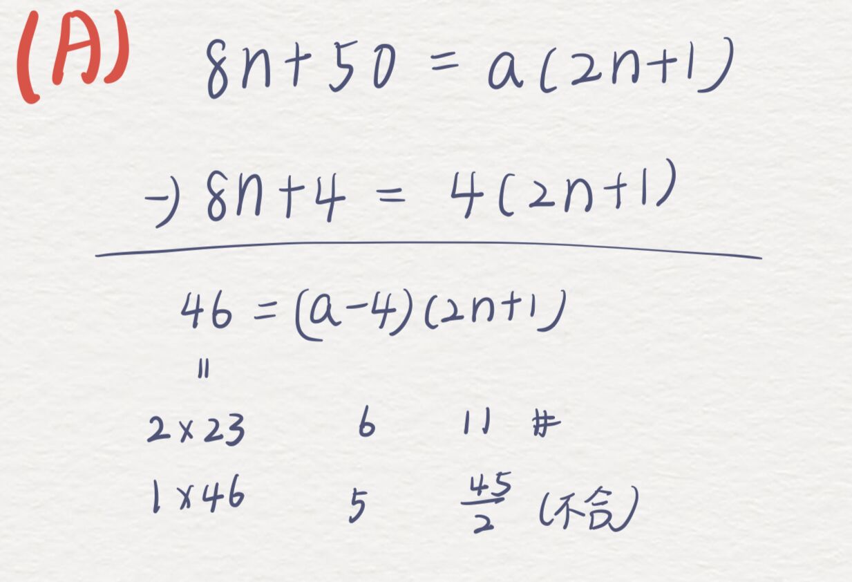 36、試問有多少個正整數 n 使得8n+50 是 2n+1 的倍數?