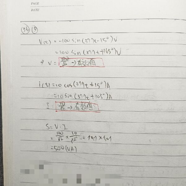 36 有一交流電路之電壓 v(t)= -100sin(377t-15°)V、電流 i(t)=10cos(377t+15°)A,則其視在功率為何?