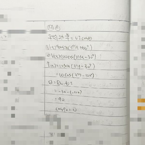 36 有一交流電路之電壓 v(t)=100 sin(377t+60°) V、電流 i(t)=10 sin(377t-30°) A,則其平均功率為何?