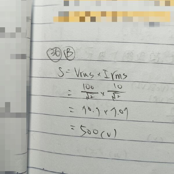 36 有一交流電路之電壓 v(t)=100sin(377 t-20°)V、電流 i(t)=10sin(377 t+10°)A,則其視在功率為何?