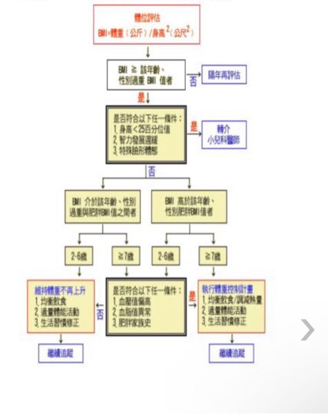 36 某 7 歲兒童的 BMI 值大於該年齡與性別過重 BMI 值者,依據衛生福利部「兒童與青少年肥胖定義及處理