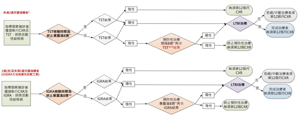 1.小於兩歲以結核菌素試驗TST做為檢測工具,2-5歲才是使用IGRA進行檢測。