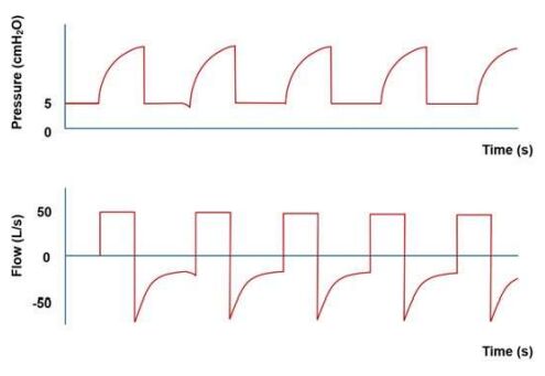 36. 35歲男性,理想體重為60公斤,因呼吸急促至急診就醫,被診斷為氣喘急性惡化。在接受短效支氣管擴張劑與靜脈注射類固醇治療後仍持續嚴重的呼吸困難且合併高碳酸血症,因此接受插管與侵襲性呼吸器的治療。其初始呼吸器設定為容量控制-輔助控制模式(Volume Control Assist-Control),潮氣容積450 mL,氧氣濃度30%,吐氣末正壓4 cmH₂O,呼吸速率每分鐘26次。病人在加護病房突然出現低血壓與心搏過速的情形,初步判斷沒有氣胸,此時呼吸器面板出現以下波形(如附圖),請問下列哪一項處置最為合理?