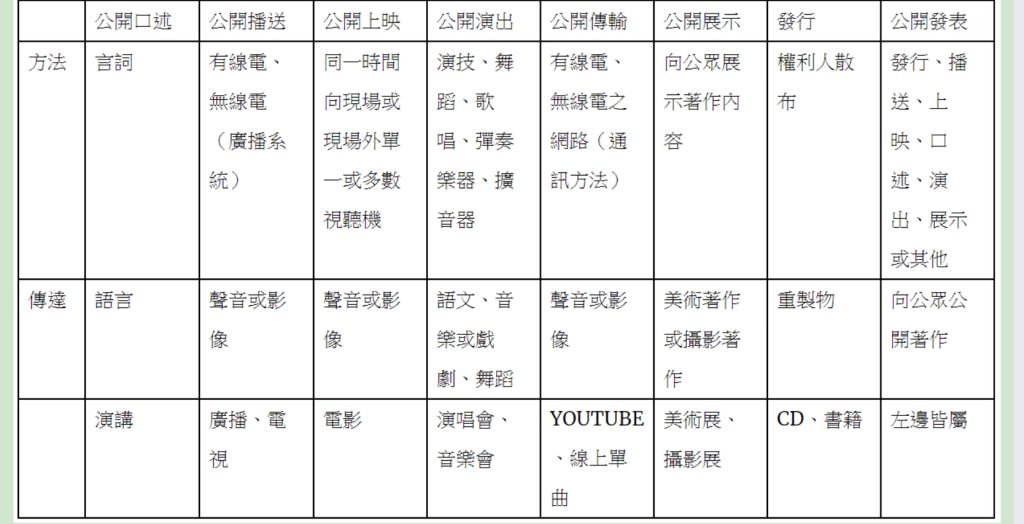 (C)公開演出:指以演技、舞蹈、歌唱、彈奏樂器或其他方法向現場之公眾傳達著作內容。以擴音器或其 他器材,將原播送之聲音或影像向公眾傳達者,亦屬之 (D)公開上映:指以單一或多數視聽機或其他傳送影像之方法,於同一時間向現場或現場以外一定場所之公眾傳達著作內容
