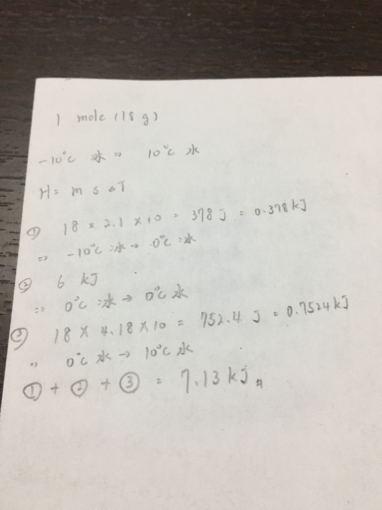37 試問需要吸收多少的熱量,才能將 1 莫耳(18.0g),由-10℃的冰化成 10.0℃的水?(已知冰的比熱=2.1 J/g℃, 水的比熱=4.18 J/g℃,冰的莫耳熔解熱=6.0 kJ/mol)