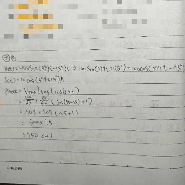 37 有一交流電路之電壓 v(t)= -100sin(377t-15°)V、電流 i(t)=10cos(377t+15°)A,則其瞬時功率最大值為 何?