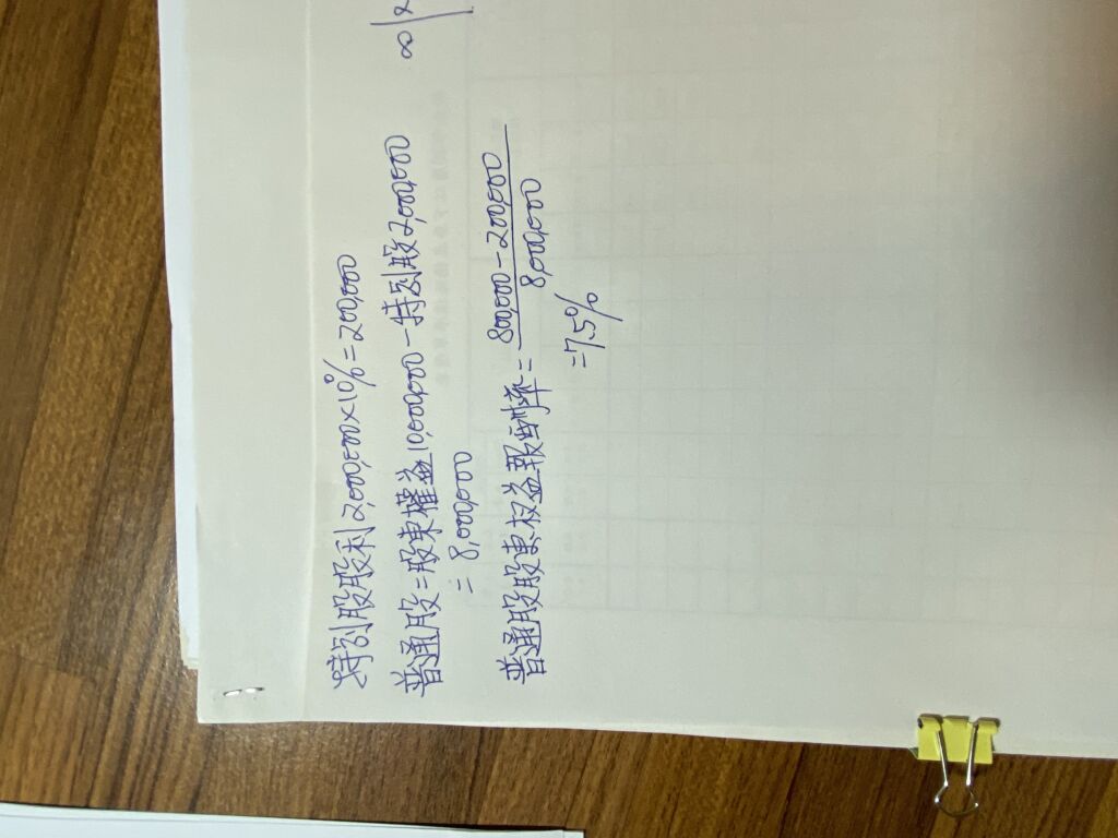 ( X3年淨利$800,000 - X3年累積特別股股本$2,000,000 *股利率10% ) / X3年普通股股東權益$8,000,000 = 0.075 ( 7.5% )