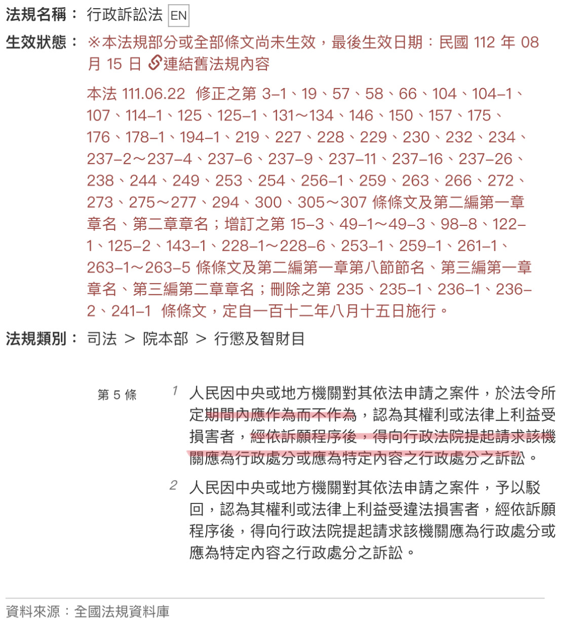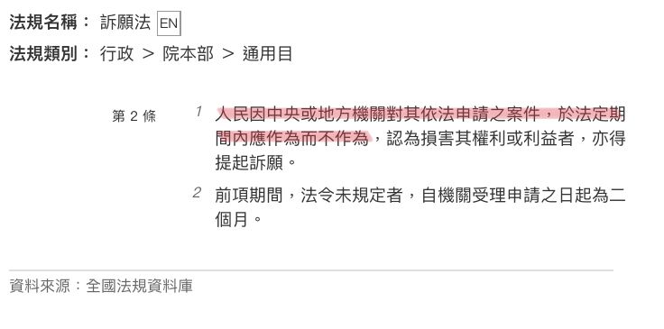 人民因中央或地方機關對其依法申請之案件,於法定期間內應作為而不作