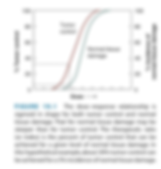 37.圖中表示在不同放射線劑量下(橫軸)對腫瘤的控制及對正常組織傷害的情形。下列敘述何者正確?