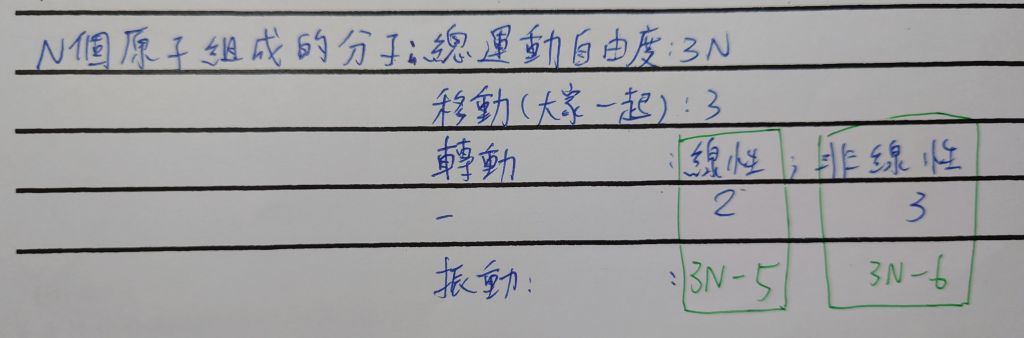 一個擁有 n 個原子的非線性分子有 3n − 6 個振動正交模(vibrational normal mode),其餘為 3 個轉動、3 個移動。而線性的分子有 3n − 5 個振動正交模,只有 2 個轉動。