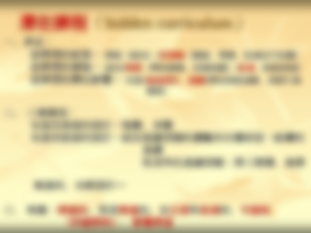 @潛在課程:指正式與非正式課程之外,學生經由學習環境中人事物或組織、過程的接觸所產生的經驗,如:師生互動。