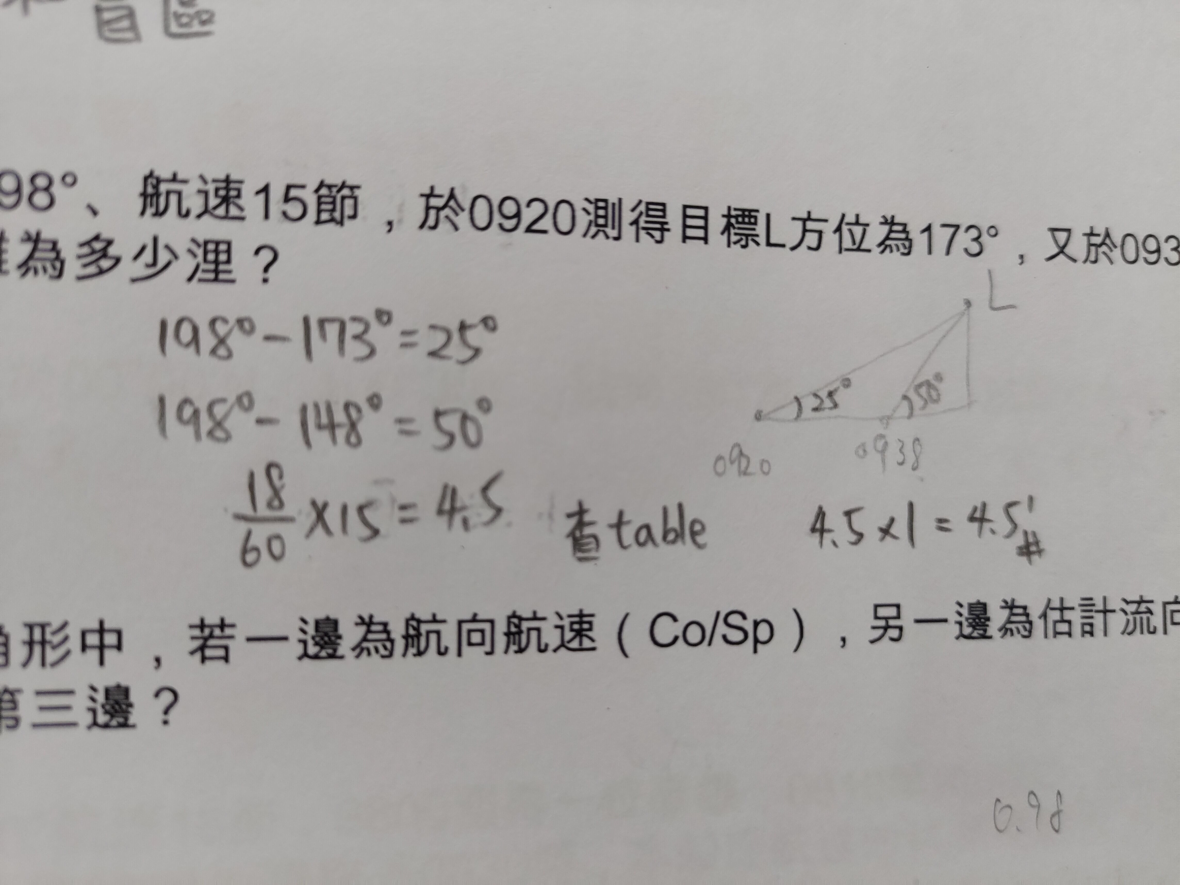 37. 某船航向198°、航速15節,於0920測得目標L方位為173°,又於0938測得L方位為148°。求 0938目標L的距離為多少浬?