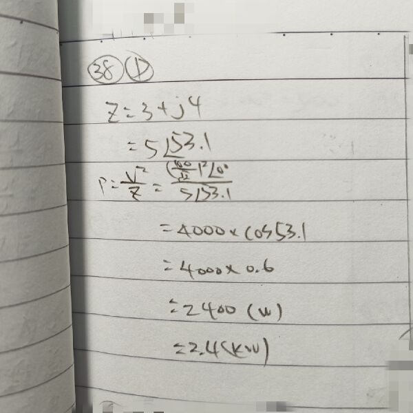 38 一 200sin(377t)伏特之交流電源,施加於阻抗值為 3 + j4 歐姆之負載上,求該負載所消耗之平均功率