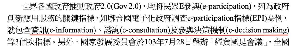 世界各國政府推動政府2.0(Gov 2.0),均將民眾E參與(e-participation),列為政府 創新應用服務的關鍵指標,如聯合國電子化政府調查e-participation指標(EPI)為例, 就包含資訊(e-information)、諮詢(e-consultation)及參與決策機制(e-decision making) 等3個次指標。