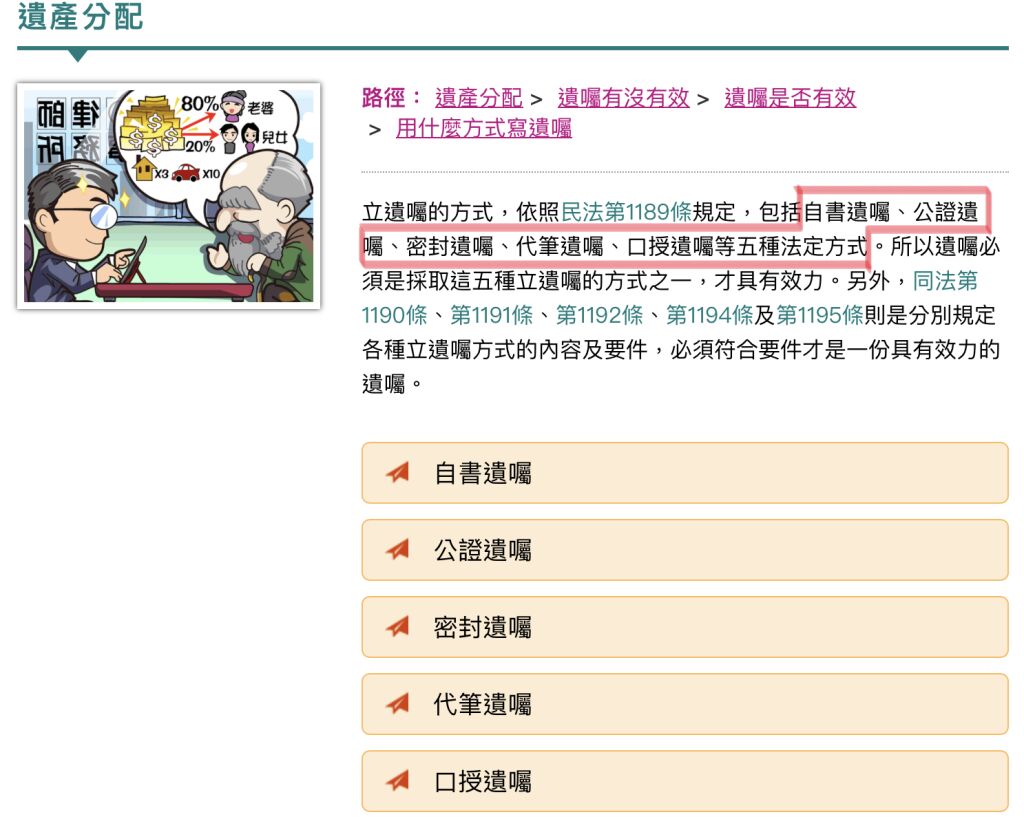 自書遺囑 公證遺囑 密封遺囑 代筆遺囑 口授遺囑