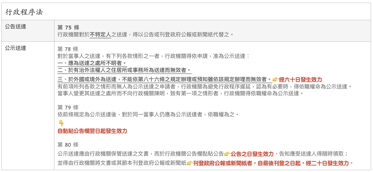 (D)【公示送達】以刊登政府公報或新聞紙為之者,【自最後刊登之日起,經 20 日發生效力】