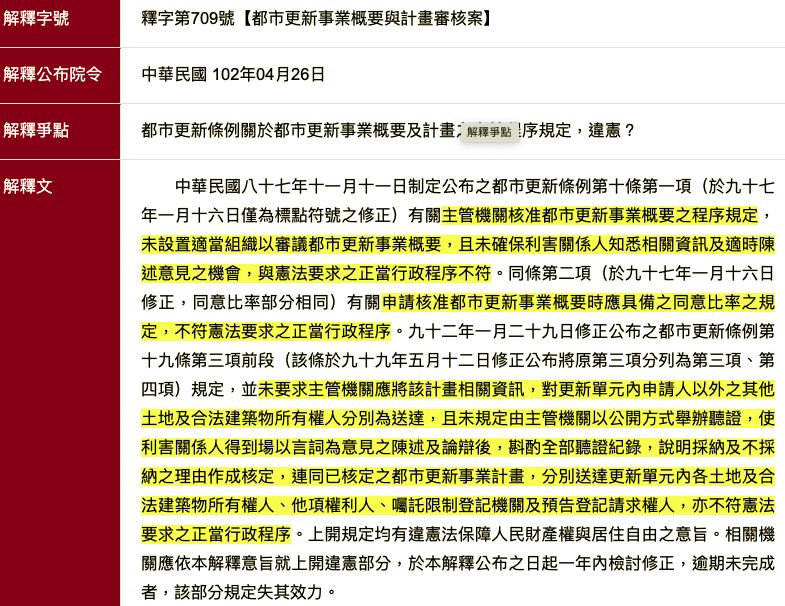 釋字709都市更新事業概要與計畫審核案