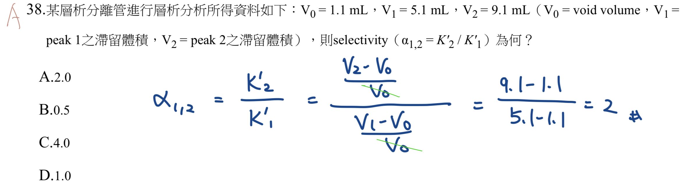 38.某層析分離管進行層析分析所得資料如下:V0 = 1.1 mL,V1 = 5.1 mL,V2 = 9.1 mL(V0 = void volume,V1 = peak 1之滯留體積,V2 = peak 2之滯留體積),則selectivity(α1,2 = K'2 / K'1)為何?
