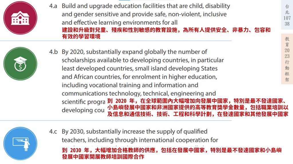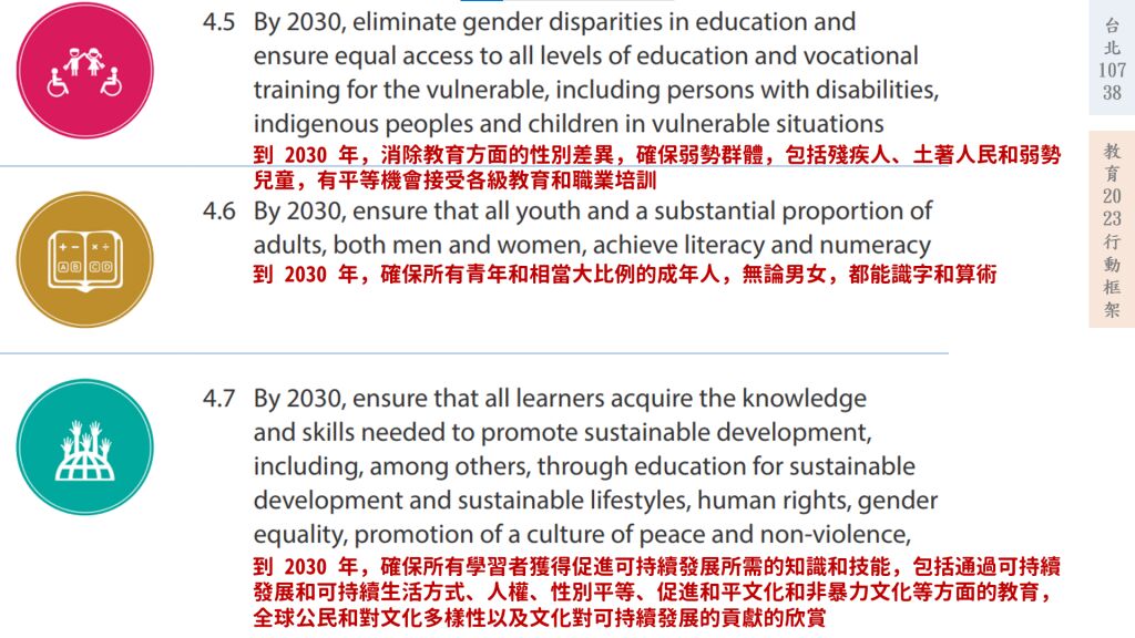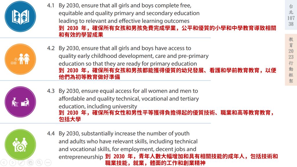 (1)確保所有青少年能完成免費、公平及優質的中小學教育,並獲致學習成效