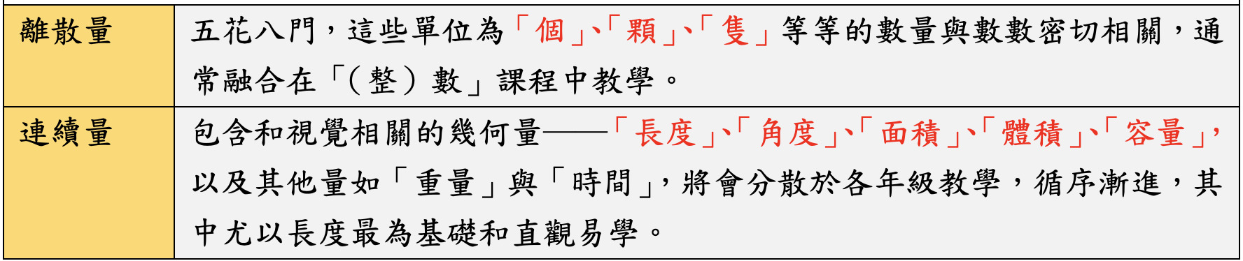 連續量:物件沒有自然的單位,需使用約定的測量工具 例:長度、面積