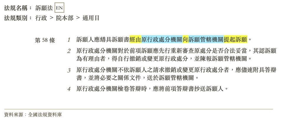 訴願法第58條第一項:「訴願人應繕具訴願書經由原行政處分機關向訴願管轄機關提起訴願。」
