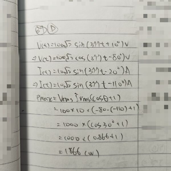 39 有一交流電路之電壓 v(t) = 100 √2 sin(377t + 10°)V、電流 i(t) = 10 √2 sin(377t -20°)A,則其瞬時功率最大值為何?
